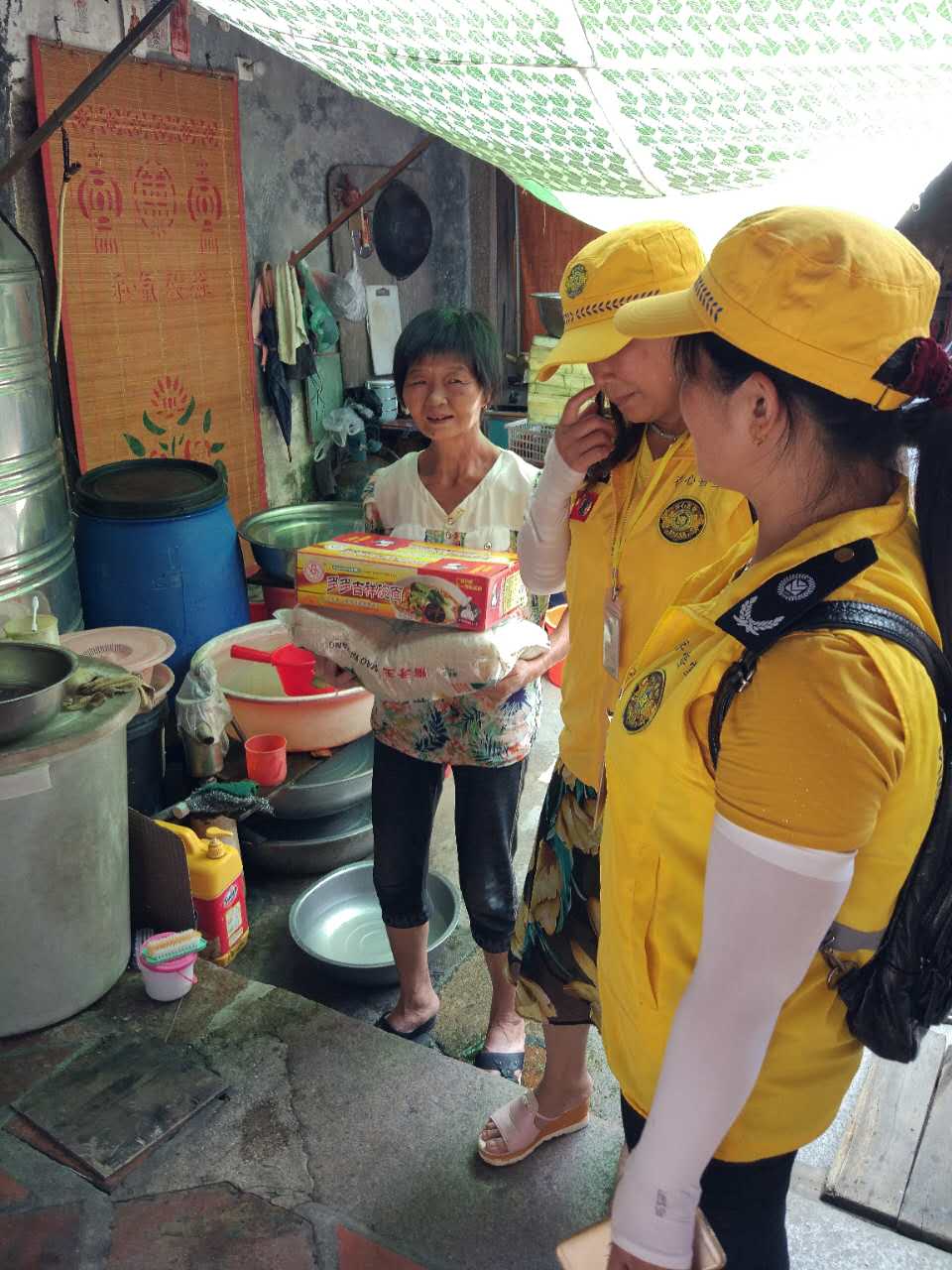 义工们走进乡村街巷,挨家挨户为贫困家庭送去生活物资,送去温暖的问候。