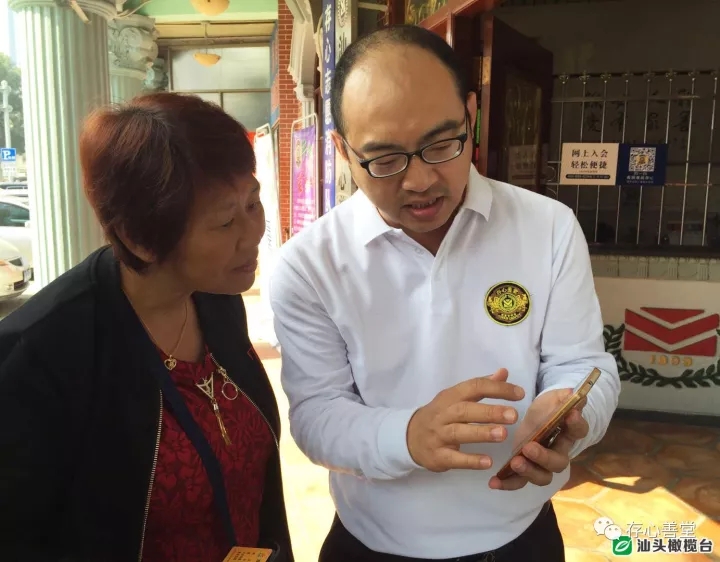 △存心慈善会网络总监许怀国(右)向陈姨介绍存心善堂会员福利